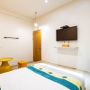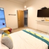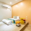 這間房以 暖橘色牆面 搭配 溫潤木質地板,營造出溫暖又放鬆的居家氛圍。床鋪上選用 柔和的藍黃配色寢具,帶來海島度假的輕鬆感,搭配可愛的 黃圓桌與紅橙色小凳,讓房間增添活潑與親切感,就像午後斜照的暖陽,靜靜地包圍著旅人。