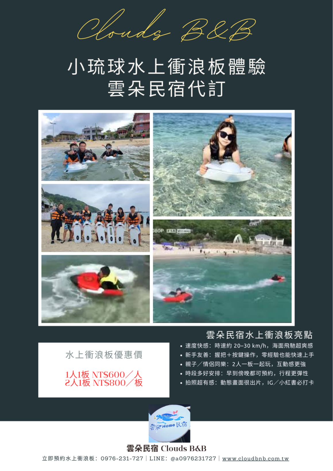想把小琉球行程玩到最有記憶點?除了浮潛、SUP、獨木舟,這個「最新潮」水上衝浪浮板一定要排進去! 入住雲朵民宿可協助代訂加購,熱門時段建議提早預約。